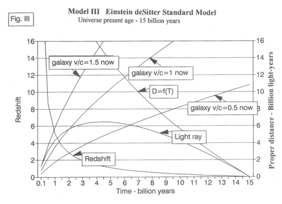 Many cosmologists use this Model III in reporting their results of observations of very distant galaxies or supernovae. If, for example, the redshift, z, of a very distant galaxy is measured as 5.34 ( recent paper using this model)(5) the model would say that the object was observed when the universe was a bit less than 1 billion years old.