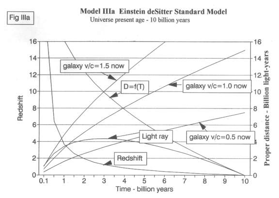 For this model, since the galaxies are slowing down, the age of the universe is not 1/H0 but 2/3H0. Thus, Figure IIIa shows this model also for an age of the universe of 10 billion years to correspond with the 15 billion years of Model II, both having the same value of H0.