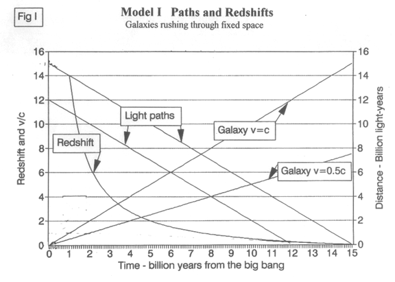 The distance away the galaxy is now, Dr, is where the galaxy line intersects the right vertical axis at an illustrative tr or t0 of 15 billion years in this example. For the reasons given above, and others, we will have to discard Model I, even though it is the easiest for most of us to visualize.