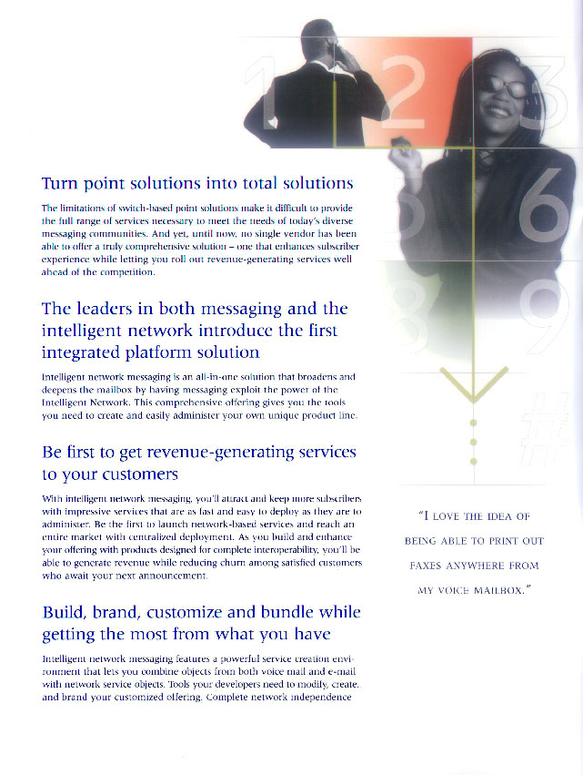 I've enjoyed writing product line and corporate capabilities brochures for leading corporations. This product brochure encourages service providers to expand their offering by adding Lucentās messaging capabilities on the IN. My goal is always to convey benefits and features in a friendly, conversational tone that informs target audiences and motivates them to act.